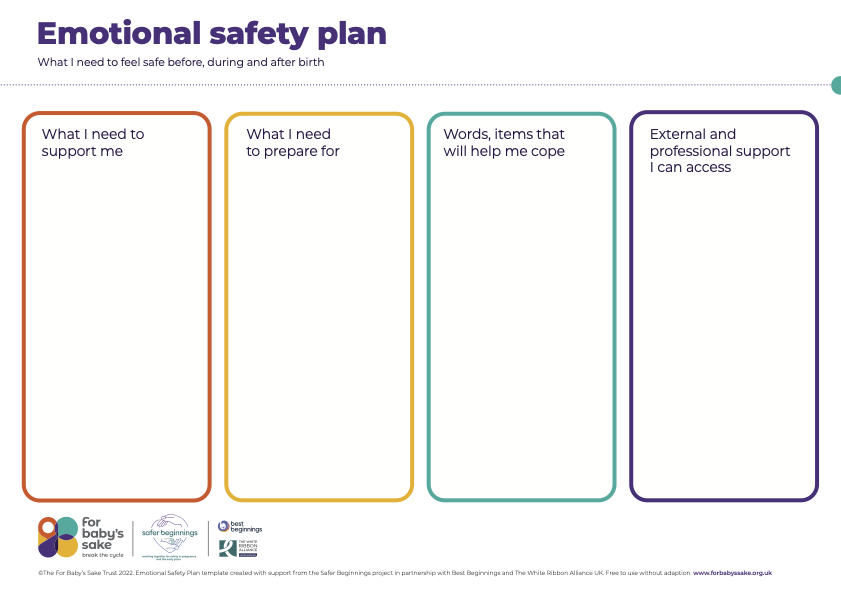 For Baby’s Sake has created a new tool called an Emotional Safety Plan. The Emotional Safety Plan is a tool that will support the whole family including mums, dads, co-parents, or non-birthing partners to record what they may need to feel emotionally safe before, during and after birth.